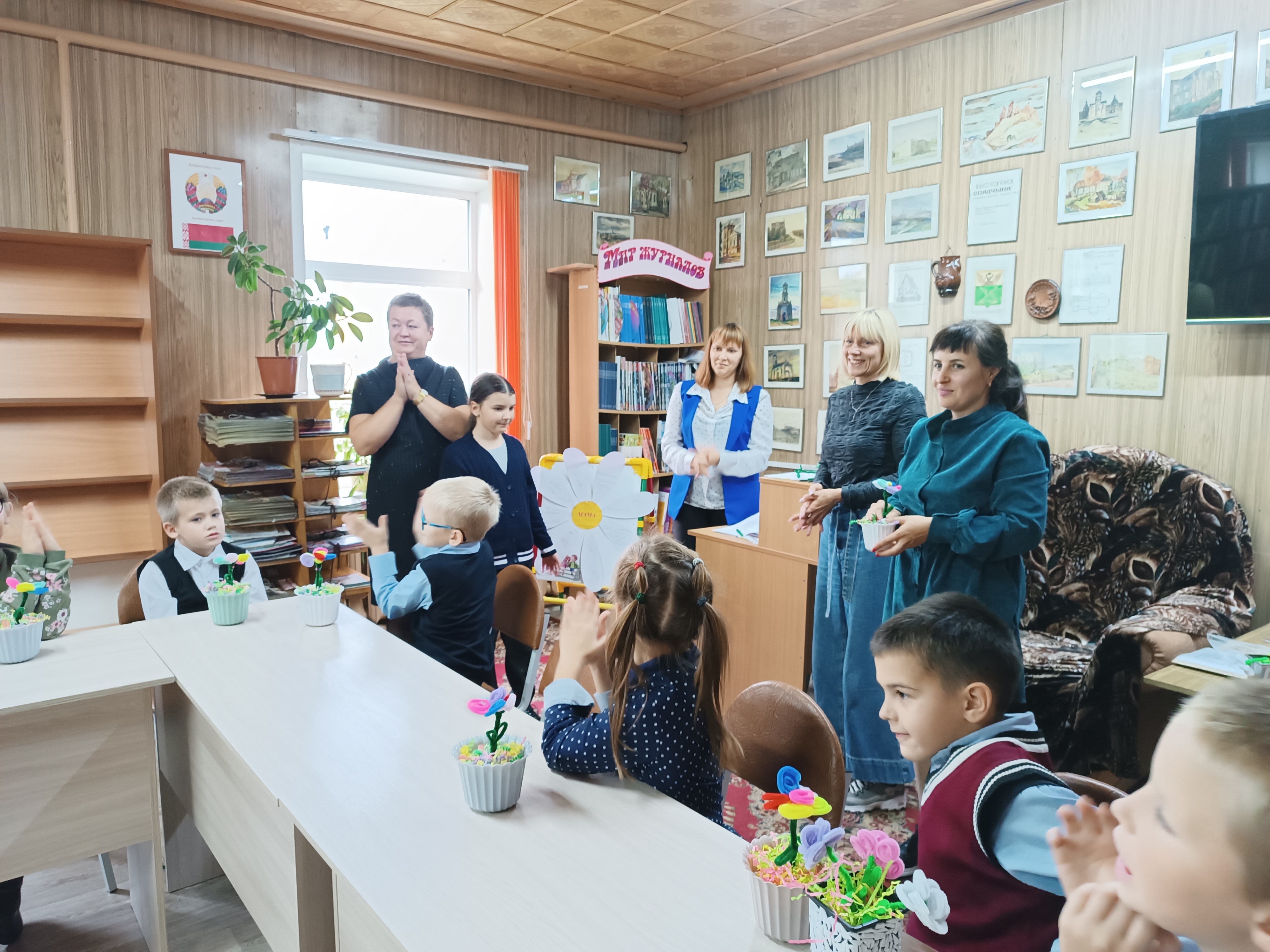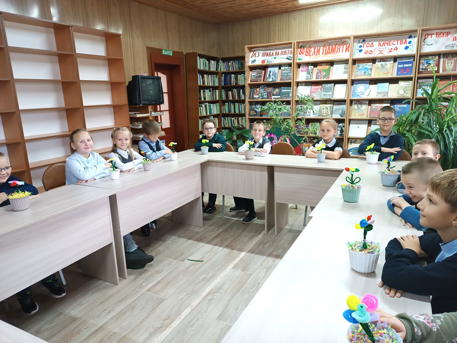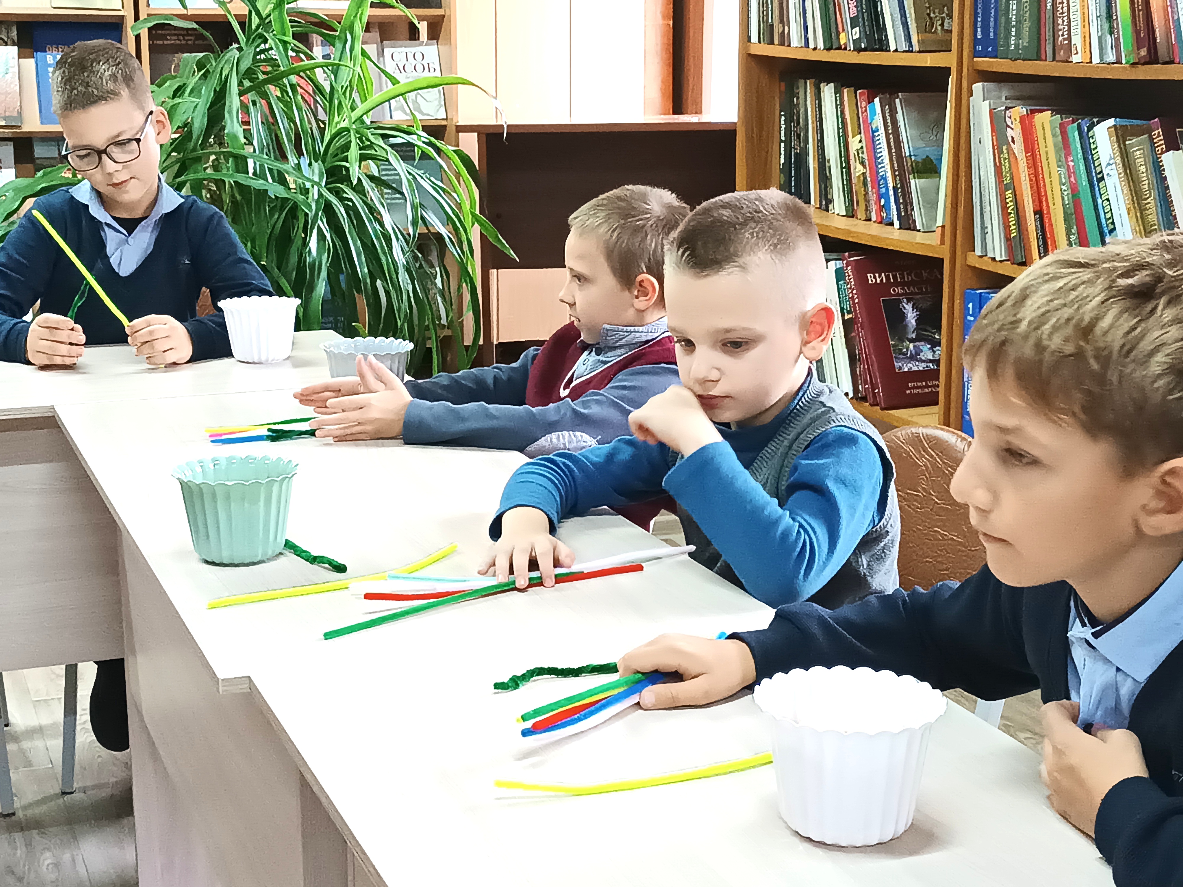 Ученики младших классов ГУО ”Средняя школа №2 им. А. К. Касинцева“ посетили в районной библиотеке мастер-класс ”Подарок для мамы“ по изготовлению горшочков с цветами из декоративной проволоки.